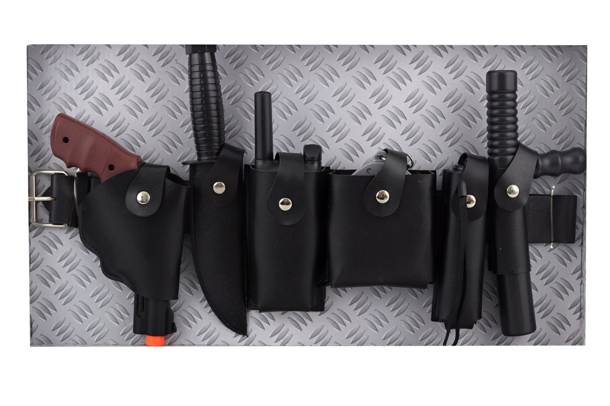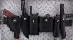 - Cintura in pelle (circa 43 cm), pistola, coltello, ricetrasmittente, manette, torcia a batteria, manganello