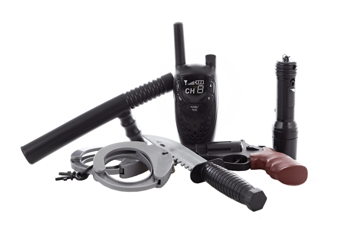 Il set da poliziotto per bambini con solida cintura in pelle e ricca dotazione farà la felicità di tutti i piccoli tutori della legge. La confezione contiene tutto il necessario per un gioco d'azione: pistola, coltello, ricetrasmittente, manette, torcia a batteria e manganello. Sono incluse anche 3 batterie AG13, quindi il divertimento può iniziare subito. Adatto ai bambini dai 6 anni.