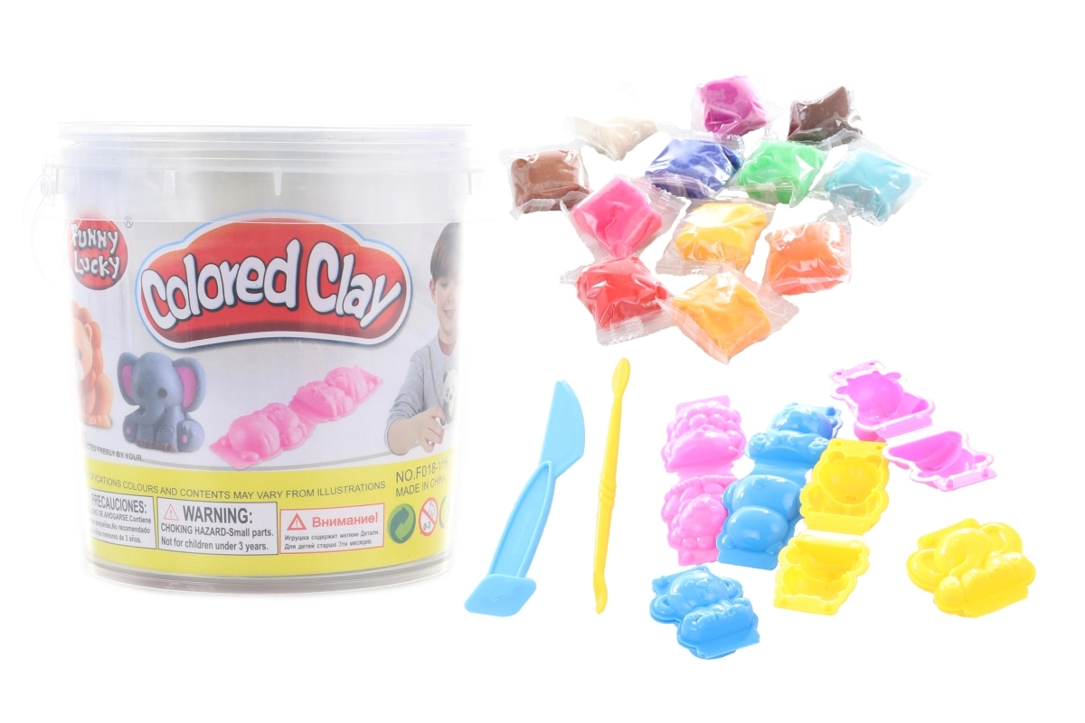 Il set per dipingere contiene 12 confezioni di pasta da modellare in colori assortiti, 6 formine e un coltello di plastica. Tutto è riposto in un pratico secchiello di plastica. Dimensioni della confezione circa 13 x 13 x 12,5 cm. Età 3+