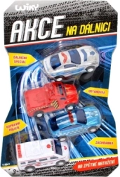 Set di quattro macchinine con funzione di rinculo per un divertente viaggio sull'autostrada. La lunghezza di ogni macchinina è di 7 cm. Un regalo perfetto per i piccoli appassionati di auto e giochi.