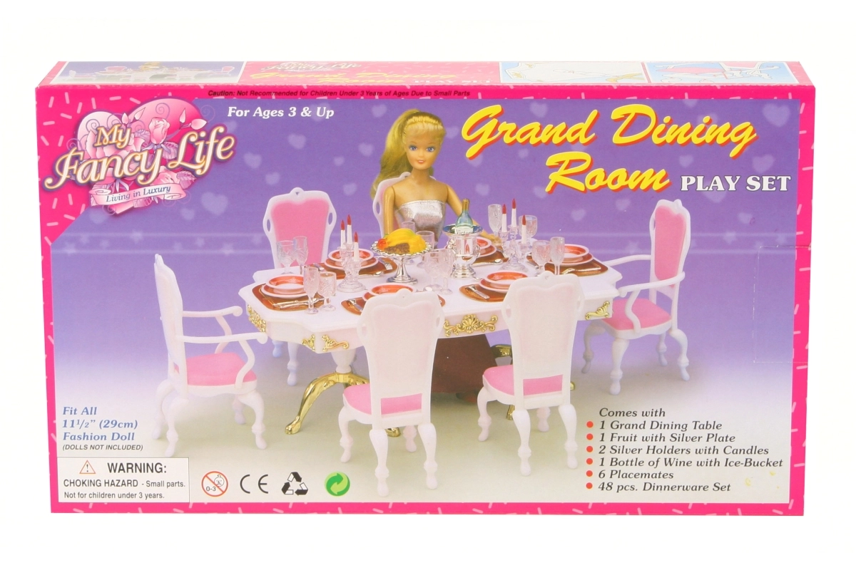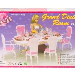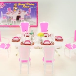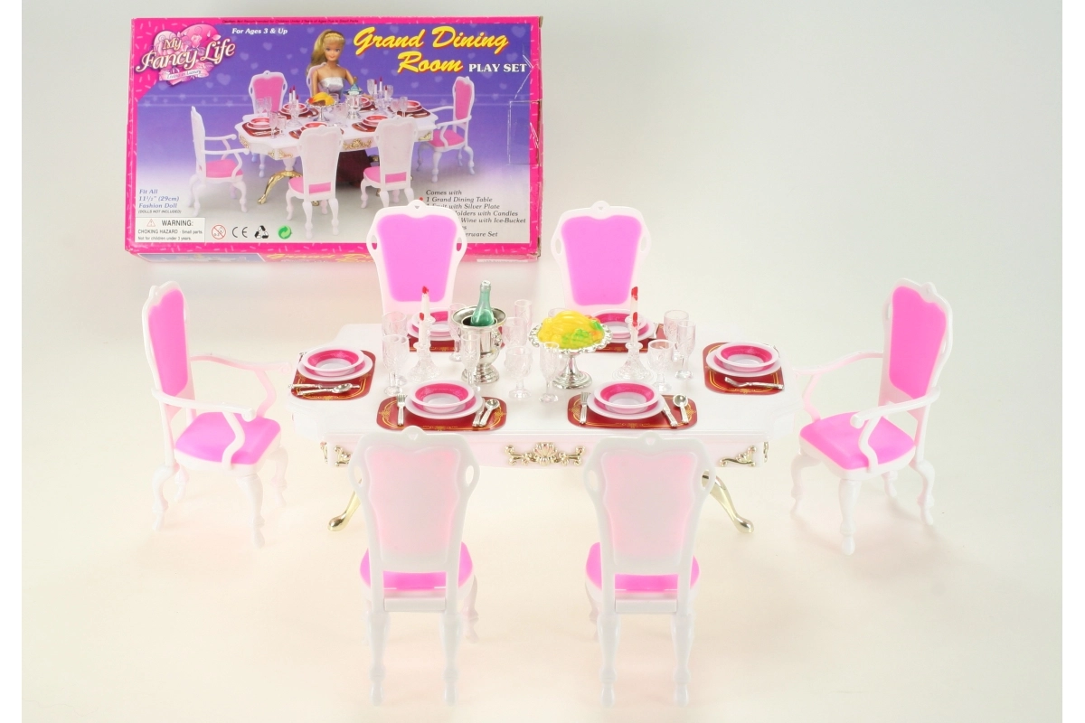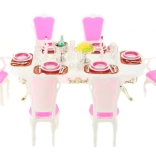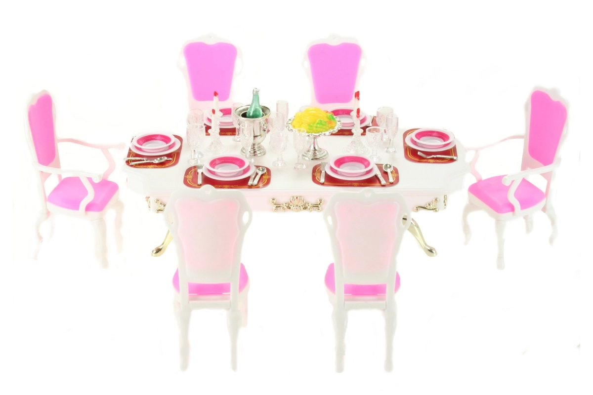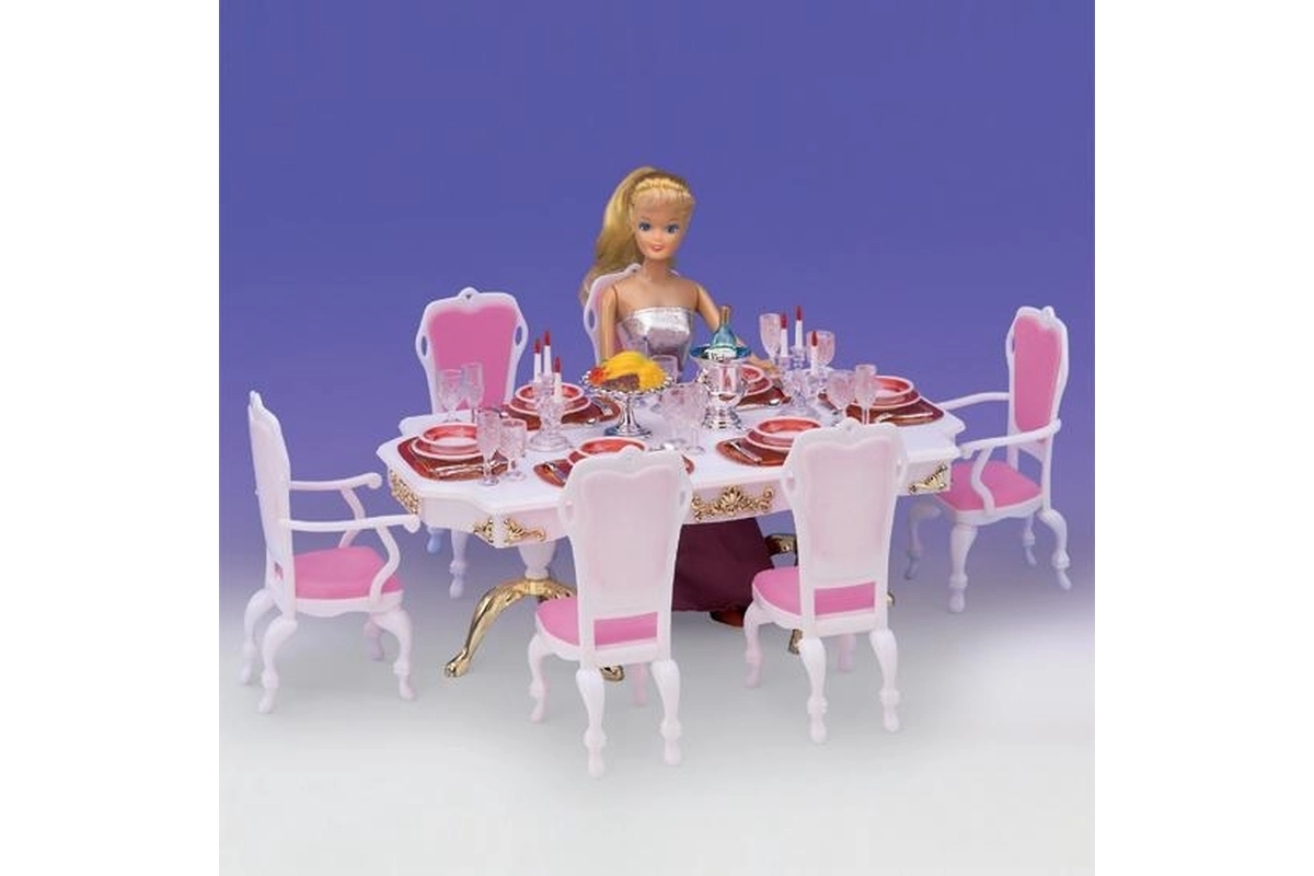 Il set elegante Glorie per la tavola delle bambole trasforma ogni cameretta in una raffinata sala da pranzo. Include un grande tavolo in plastica, 6 sedie (2 con braccioli) e un ricco apparecchiamento con bicchieri, piatti e posate. Ideale per il gioco creativo dei bambini dai 3 anni in su.