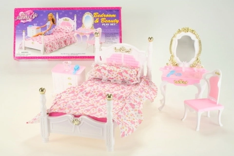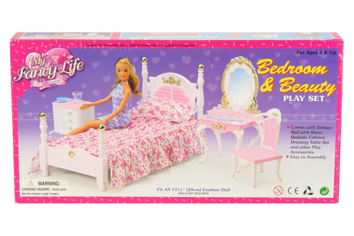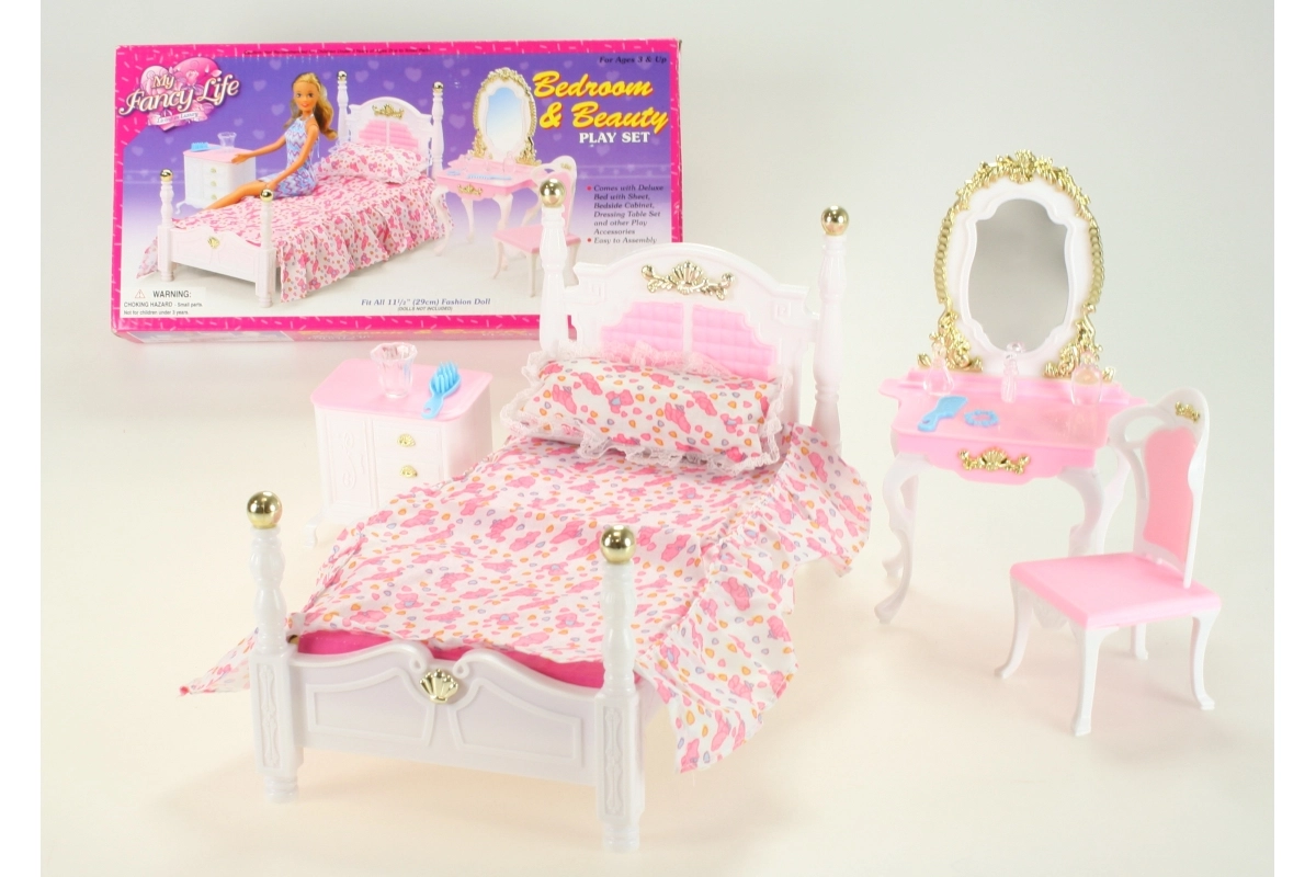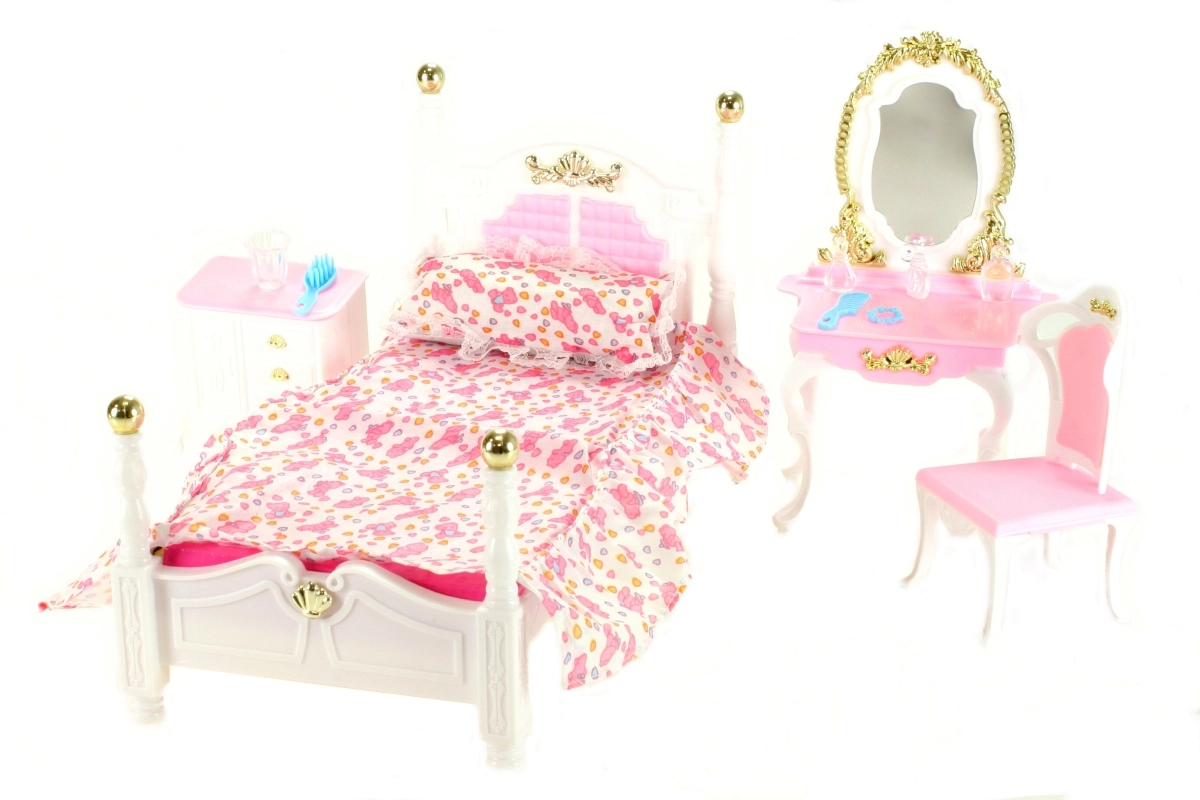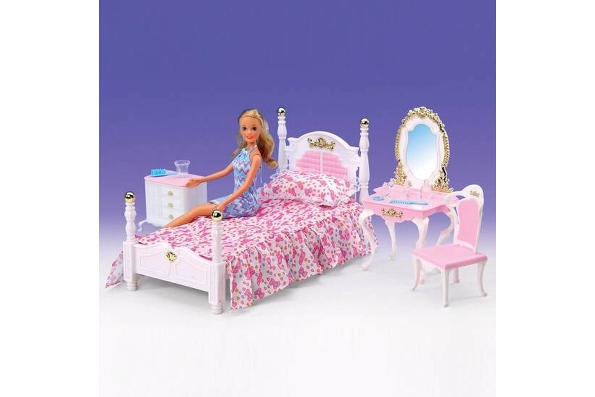 La Glorie Camera da Letto include: un letto in plastica di circa 16 cm x 34 cm x 18 cm con copriletto e cuscino; un tavolino da toeletta di circa 13 cm x 8 cm x 22 cm con accessori per bambole – pettinino, braccialetto, spazzola e boccette; una poltrona di circa 7 cm x 7 cm x 13 cm; un comodino di circa 8,5 cm x 6 cm x 8 cm. La bambola non è inclusa nella confezione. Età 3+.