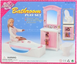 Offri ai giochi dei bambini un arredo realistico con il set bagno Glorie. Il set include un tavolino toilette con lavabo, una vasca e un WC in dimensioni per bambini, completati da accessori pratici come cosmetici, sapone e asciugamano. Realizzato in plastica resistente, adatto ai bambini dai 3 anni. La bambola non è inclusa nella confezione.