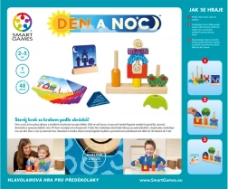 Giorno e Notte è un gioco logico per un giocatore, progettato con intelligenza, che accompagna i bambini dalle prime costruzioni semplici fino a compiti spaziali più complessi. Sulle carte diurne sono visibili tutti i dettagli, mentre le carte notturne mostrano solo i contorni: il bambino allena così immaginazione, attenzione e motricità fine.