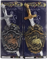 Spada in plastica di circa 49 cm e scudo con dimensioni di circa 26 x 19 cm. Dimensioni della confezione circa 52,5 x 21 x 2 cm. Età 3+.