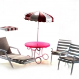 Sdraio in plastica, 2 seggioline da giardino in plastica, tavolino da giardino in plastica, ombrellone