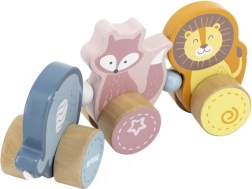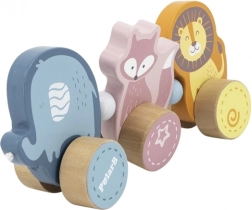 Elefante, volpe e leone collegati in un piccolo convoglio stimolano l’immaginazione e invitano al gioco creativo.