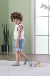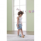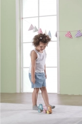 Il giocattolo è realizzato in legno laccato resistente e colorato con vernici atossiche, sicure per i bambini. I bordi levigati e le dimensioni maneggevoli sono ideali per le piccole mani. Nel gioco sia condiviso sia individuale, i bambini allenano creatività, motricità fine e fantasia.