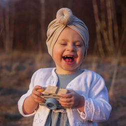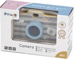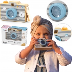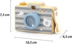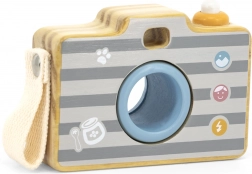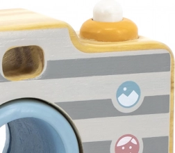 Il giocattolo è realizzato in legno di qualità e rifinito con colori atossici e sicuri per i bambini. La costruzione robusta, i bordi lisci e l’impugnatura laterale garantiscono un uso comodo e sicuro. La fotocamera sviluppa al meglio motricità fine, coordinazione e creatività durante il gioco di ruolo.