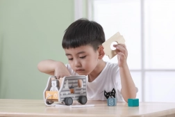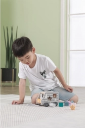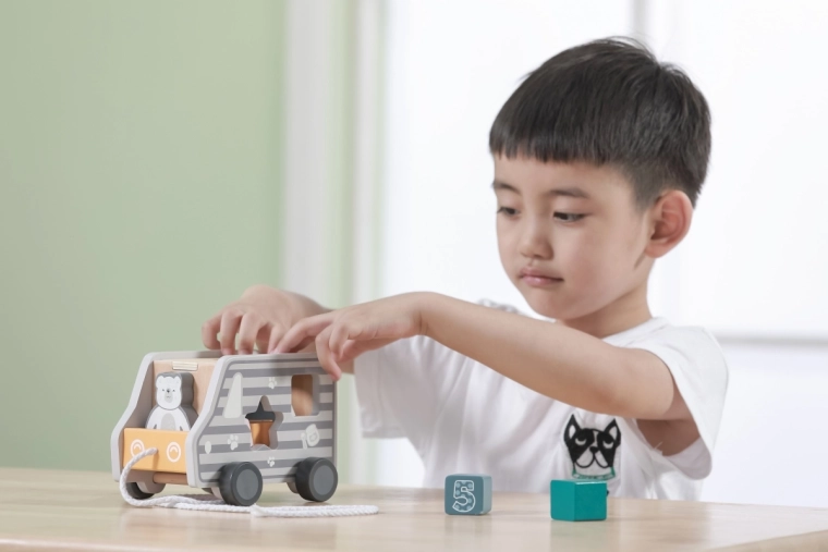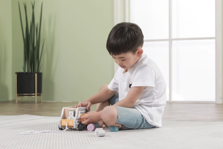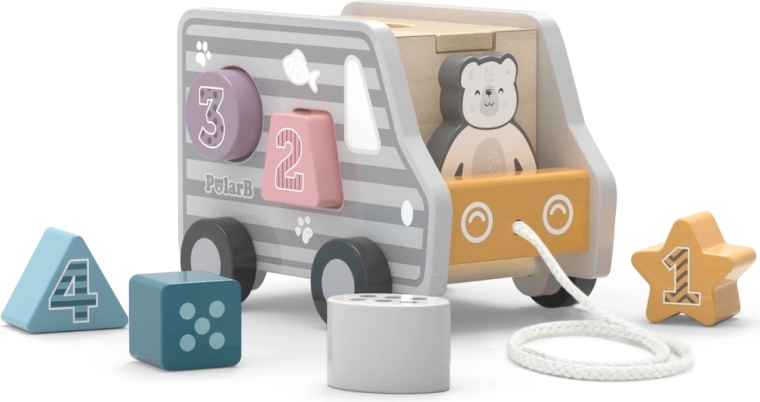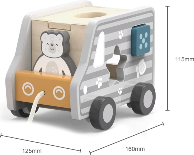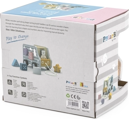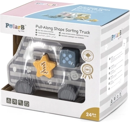 Rimorchio e gioco di incastri in legno a forma di camion. Dimensioni ca. 18 x 12 x 6,5 cm. Dimensioni della confezione ca. 19 x 16,5 x 13,5 cm. Età 18 mesi e oltre