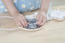 Pezzi in legno levigati con fori sicuri e cordicelle robuste. Ideale per esercitare quotidianamente la motricità fine.