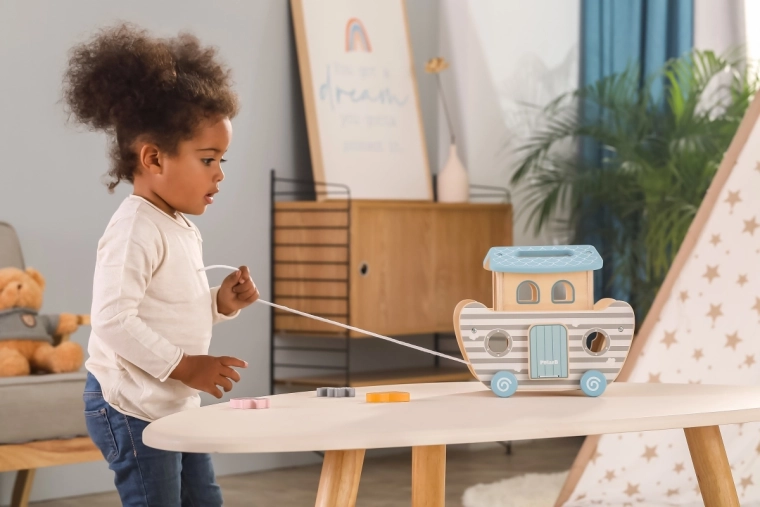Grazie al cordoncino, l’arca si può tirare facilmente per la stanza. I bambini sviluppano equilibrio, camminata e ritmo del movimento durante un gioco divertente.