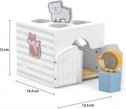 Inserto in legno con animaletti. I cubetti fanno rumore come sonagli. Dimensioni dell’inserto circa 13,5 x 12 x 14,4 cm. Dimensioni della confezione circa 15 x 14,5 x 13 cm. Età 18 mesi e oltre.