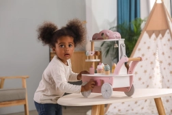 • Design per bambini: delicati colori pastello, dettagli accattivanti, campanella e ruote.