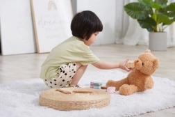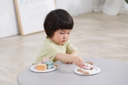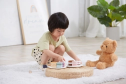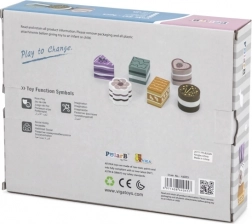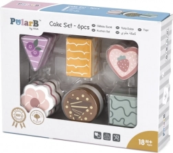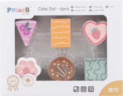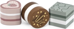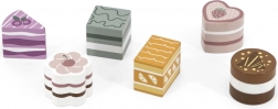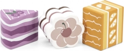 Questo set comprende sei graziosi dolcetti in legno di forme e colori diversi: fette di torta, dischetto, cuore e mattoncino. I bambini possono giocare alla pasticceria, servire l’orsetto o organizzare un tè delle cinque. Ogni pezzo si adatta bene alla mano del bambino e invita a giocare più e più volte.