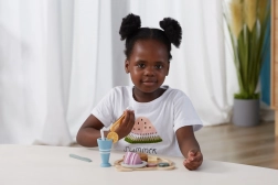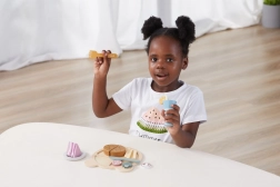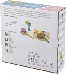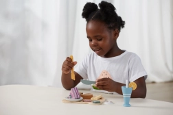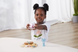 Pezzi di cibo colorati, dessert e bevanda permettono ai bambini di servire il pranzo come vero e proprio e di esercitare le basi del galateo a tavola.