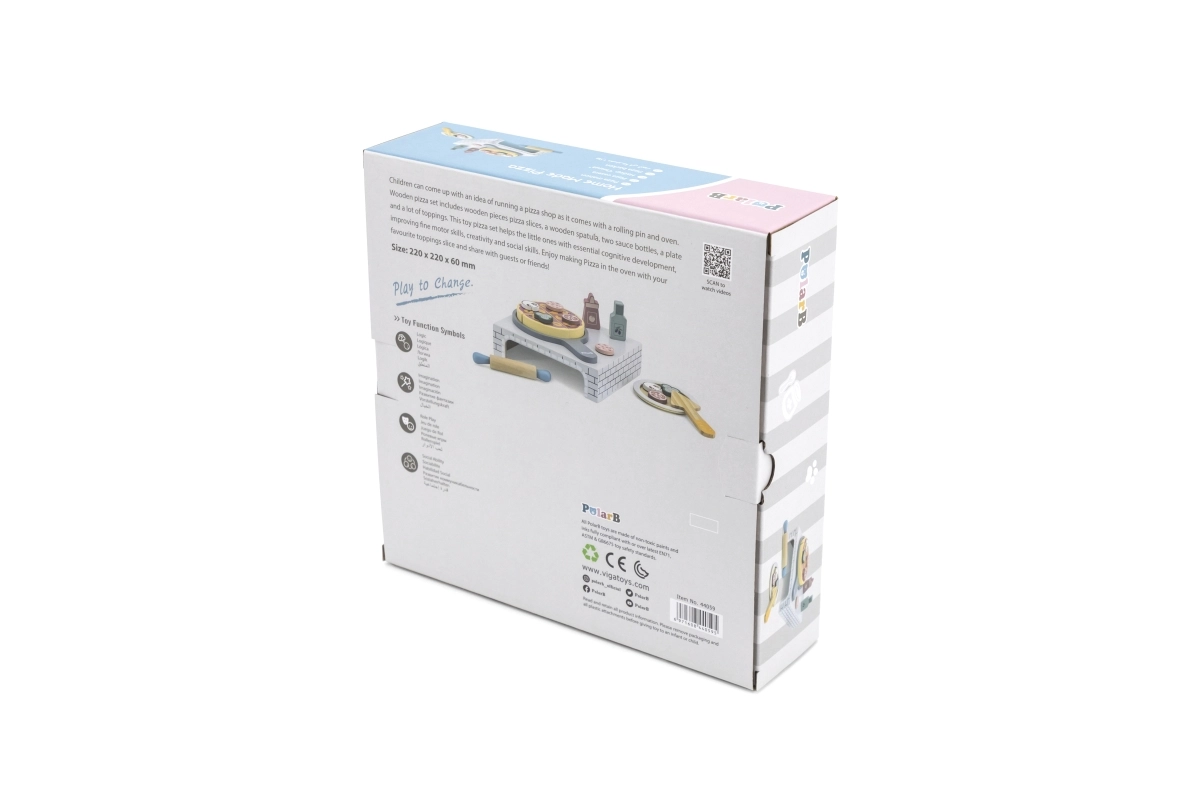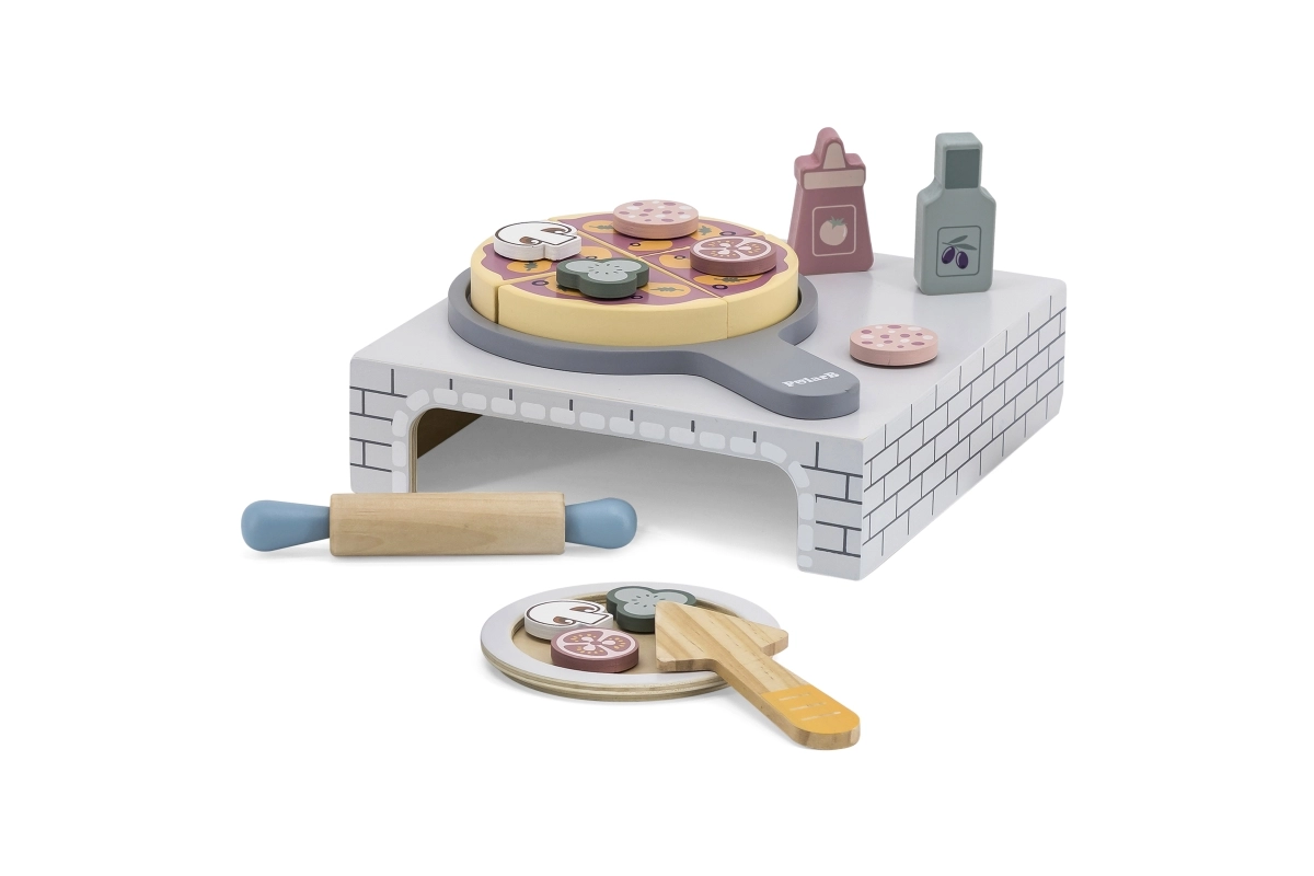 • Accessori completi: forno, pizza su pala, matterello, tagliapizza, piattino, boccette di “salse”, pinzette e topping di verdure.