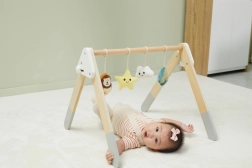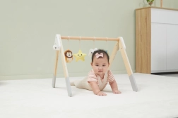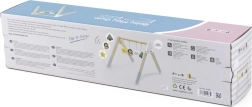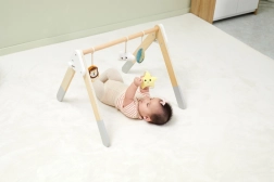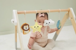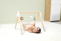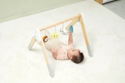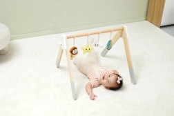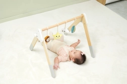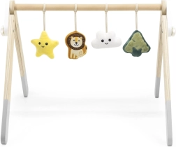 Questa baby gym in legno di alta qualità è adatta già dal 1° mese. L’aspetto naturale e i colori delicati si adattano a ogni interno. I giochi sospesi attirano il bebè con suoni e diverse texture, che stimolano vista, udito e tatto.
