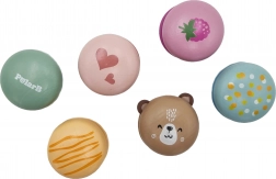 Il set include sei macaron in vari colori con motivi giocosi (cuoricini, frutta, animaletti) che stimolano la fantasia e il gioco tematico.