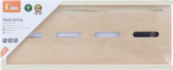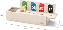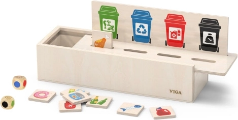 Il giocattolo insegna ai bambini la corretta separazione dei rifiuti utilizzando tessere in legno divertenti e bidoni contrassegnati a colori.