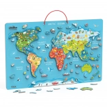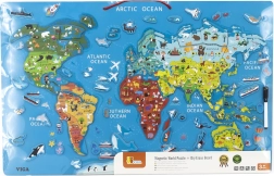 La mappa è composta da 106 pezzi magnetici che rappresentano paesi, mezzi di trasporto e animali, rendendo più facile l'apprendimento della geografia.