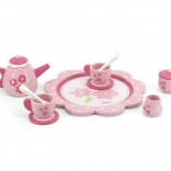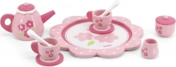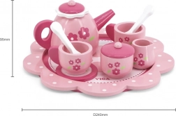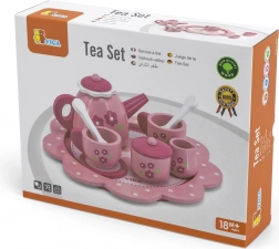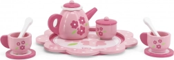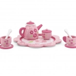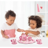 Il set contiene tutto il necessario per giocare al tè: teiera, bricco, zuccheriera, tazze, piattini, cucchiaini e vassoio.