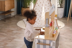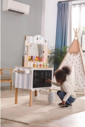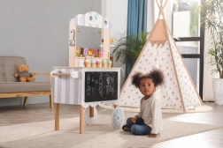 Questo chiosco in legno funziona come negozio, pasticceria o chiosco di gelati. I bambini possono giocare al loro scenario preferito grazie ai numerosi accessori come lecca-lecca, gelati, cialde e topping. Un'eccellente aggiunta è la lavagna per scrivere o disegnare il menù del giorno. L'intero set è dipinto con colori atossici in tonalità delicate, che attirano l'attenzione dei bambini.