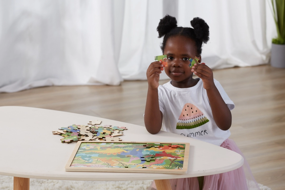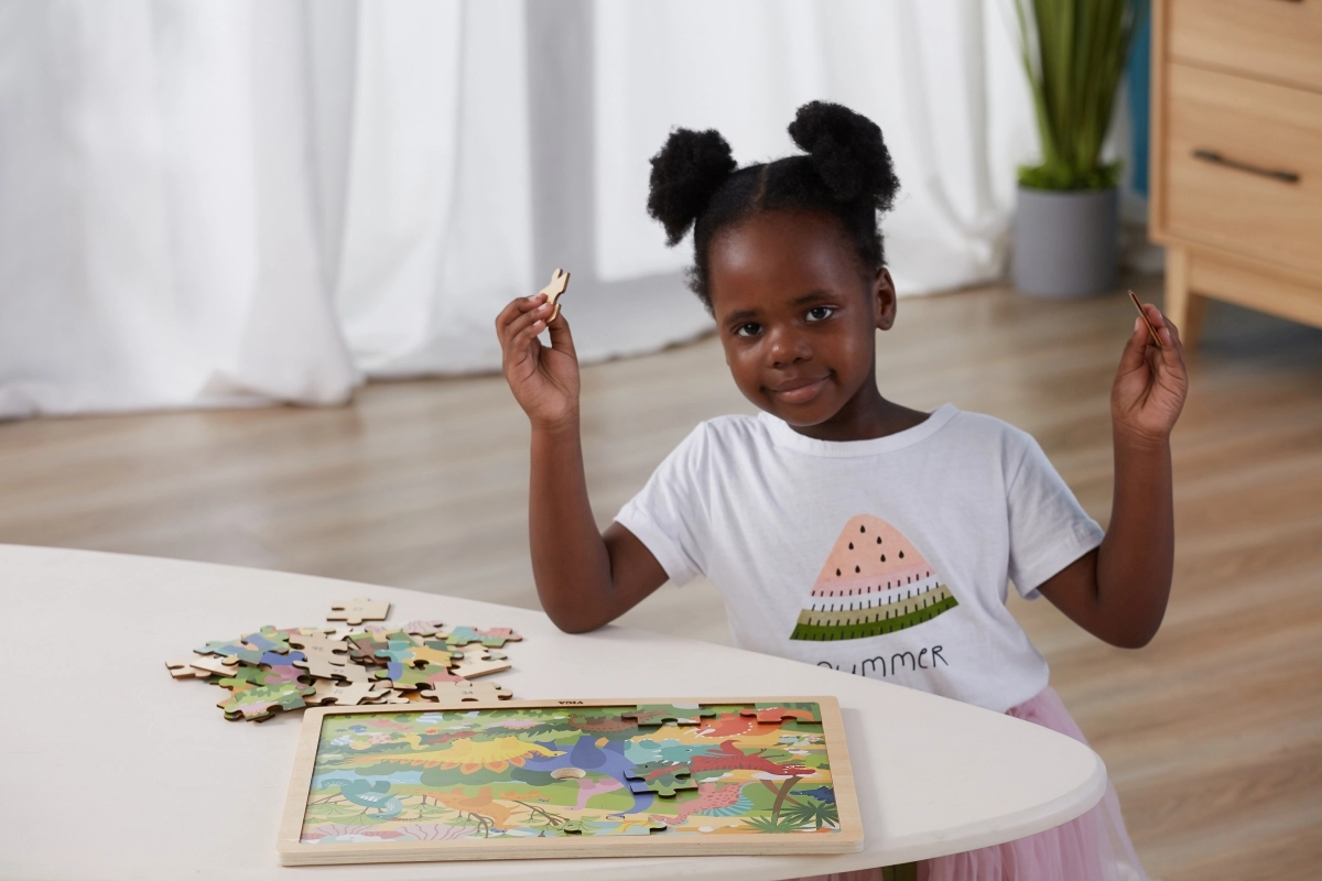 Il vassoio in legno robusto mantiene i pezzi in posizione, facilita il trasporto e la sistemazione e aiuta i bambini a concentrarsi nel comporre l’immagine.