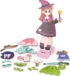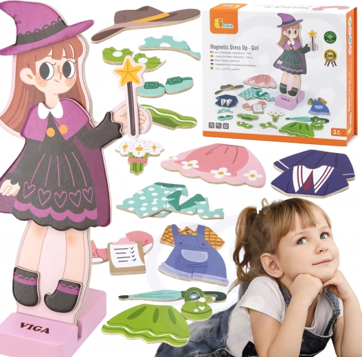 Scopri il mondo creativo dei travestimenti con il puzzle in legno di alta qualità VIGA. I pezzi magnetici degli abiti si applicano facilmente alla figurina della bambina, permettendo ai bambini di cambiare rapidamente outfit e creare combinazioni divertenti. Il giocattolo è realizzato in legno resistente e colorato con vernici atossiche, adatte ai bambini.