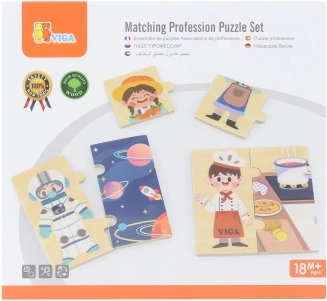 Il gioco didattico in legno VIGA introduce i bambini in modo divertente a diverse professioni – dal medico e pompiere al cuoco o astronauta. Ogni professione è composta da tre parti: due per il personaggio e una più grande per il luogo di lavoro. I bambini formano così la coppia corretta e la collegano all’ambiente.