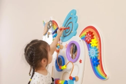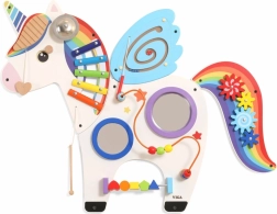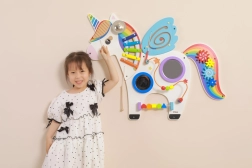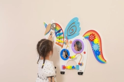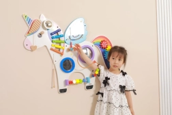 Questo pannello multifunzionale da parete a forma di unicorno combina elementi musicali, tattili e logici in un unico insieme accattivante. I bambini possono suonare lo xilofono, far girare gli ingranaggi, provare il labirinto magnetico e gli specchietti, esercitando colori, forme e coordinazione dei movimenti.