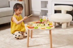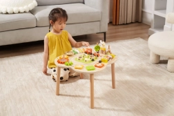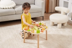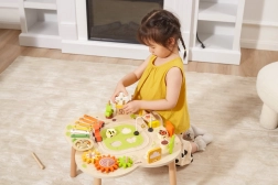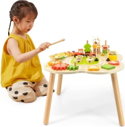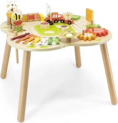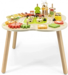 Il tavolino è rifinito con vernici sicure e atossiche in tonalità vivaci che motivano naturalmente i bambini alla scoperta. La ricca dotazione – dagli ingranaggi allo xilofono e al campanellino, fino ai pratici puzzle e alla pista dei trenini – garantisce ore di divertimento significativo nello spirito del metodo Montessori.