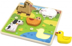 Questo adorabile puzzle in legno a tema fattoria include 5 pezzi robusti: cavallino, pecorella, gallinella, cagnolino e paperella. I bambini inseriscono gli animali nelle sagome corrispondenti sulla base colorata, allenando il riconoscimento delle forme e la memoria visiva.