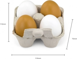 Grazioso set di uova di legno per la cucinetta dei bambini, composto da 2 uova bianche e 2 marroni in un vassoio di carta realistico. Le uova, di dimensioni circa 6 × 5 cm, supportano le giochi di ruolo, la motricità fine e l’apprendimento dei colori. Ideale per bambini a partire da 24 mesi.