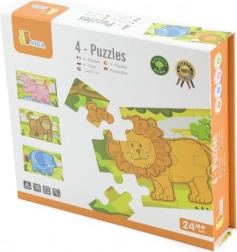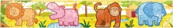Questo set di puzzle in legno con allegri animaletti della giungla farà felice ogni bambino. Ogni soggetto ha colori accesi e forme semplici che facilitano la composizione e sviluppano naturalmente l’immaginazione. Con i pezzi si possono creare quattro immagini separate oppure un lungo motivo panoramico con tutti gli animali.