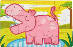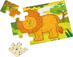 Forme semplici e colori vivaci di leone, elefante, ippopotamo e scimmietta motivano i bambini a comporre e stimolano la percezione visiva.