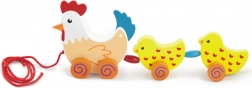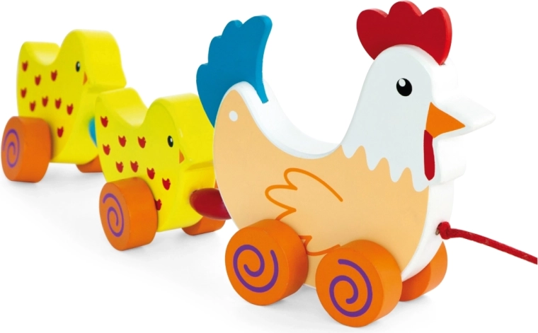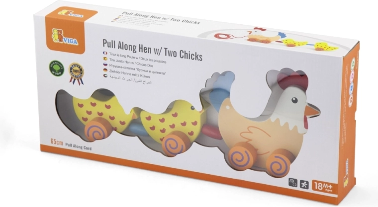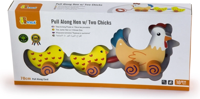 Questo giocattolo in legno da tirare collega la gallina e due pulcini con un cordoncino rosso. Tra i pulcini sono inserite perline colorate che, durante il movimento, attirano la vista e l’udito del bambino. Quando si tira, l’allegra “famigliola” dondola dolcemente e motiva i bambini a camminare.