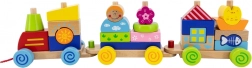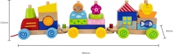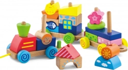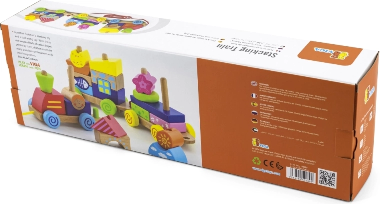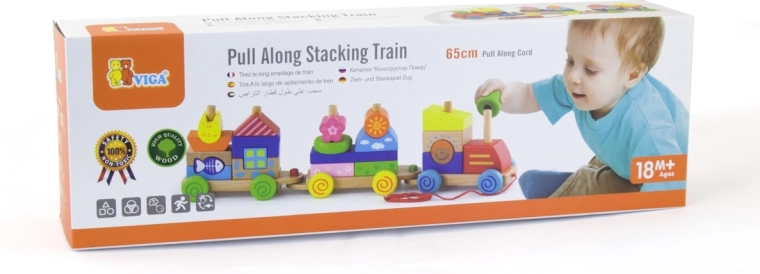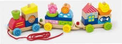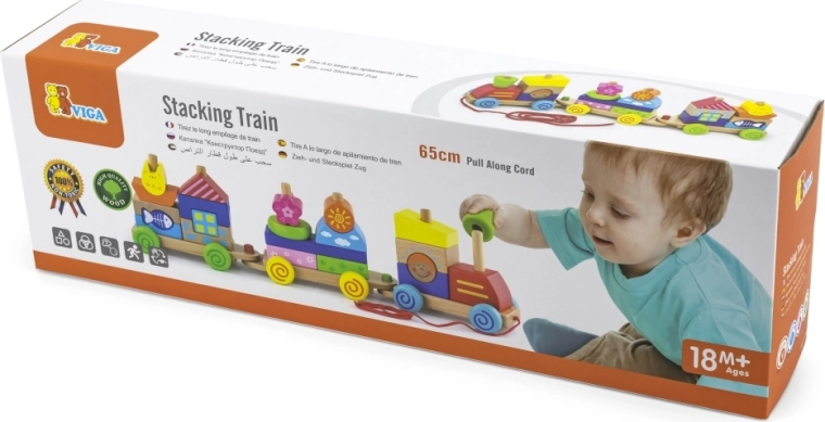 Questo trenino in legno da tirare, di alta qualità, con tre vagoni offre tantissime possibilità per impilare e ricombinare forme colorate. I bambini possono allenare la coordinazione occhio–mano, conoscere colori e forme e al tempo stesso divertirsi a trainare il trenino per casa.