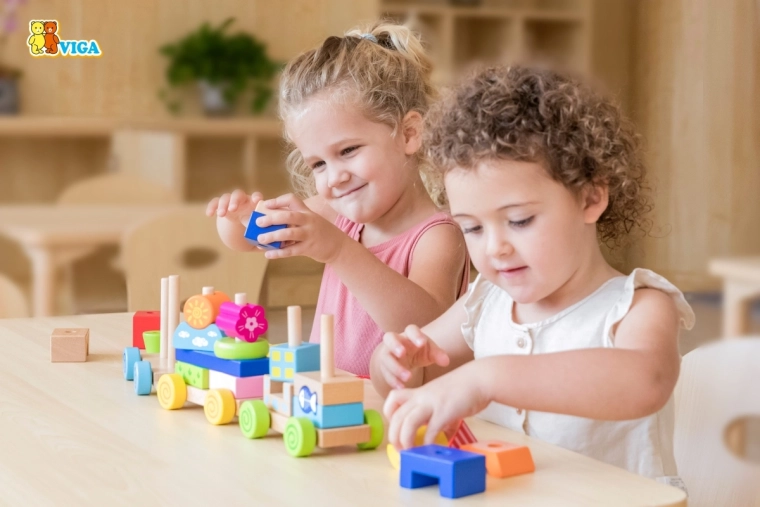 I blocchi colorati di varie forme si inseriscono sui pioli, allenando motricità fine, coordinazione e pensiero logico.