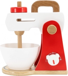 Il mixer vanta un design in rosso e bianco e elementi in legno, che ne fanno una copia realistica di un vero elettrodomestico da cucina.