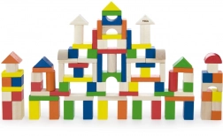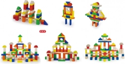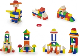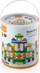 Costruzioni in legno in secchiello. Contiene 100 pezzi e un opuscolo illustrato con istruzioni di montaggio. Dimensioni della confezione ca. 18 x 21 cm. Dimensioni dei blocchi da 2,5 a 7,5 cm a seconda del tipo. Età 2+