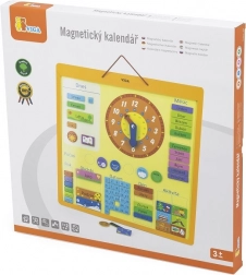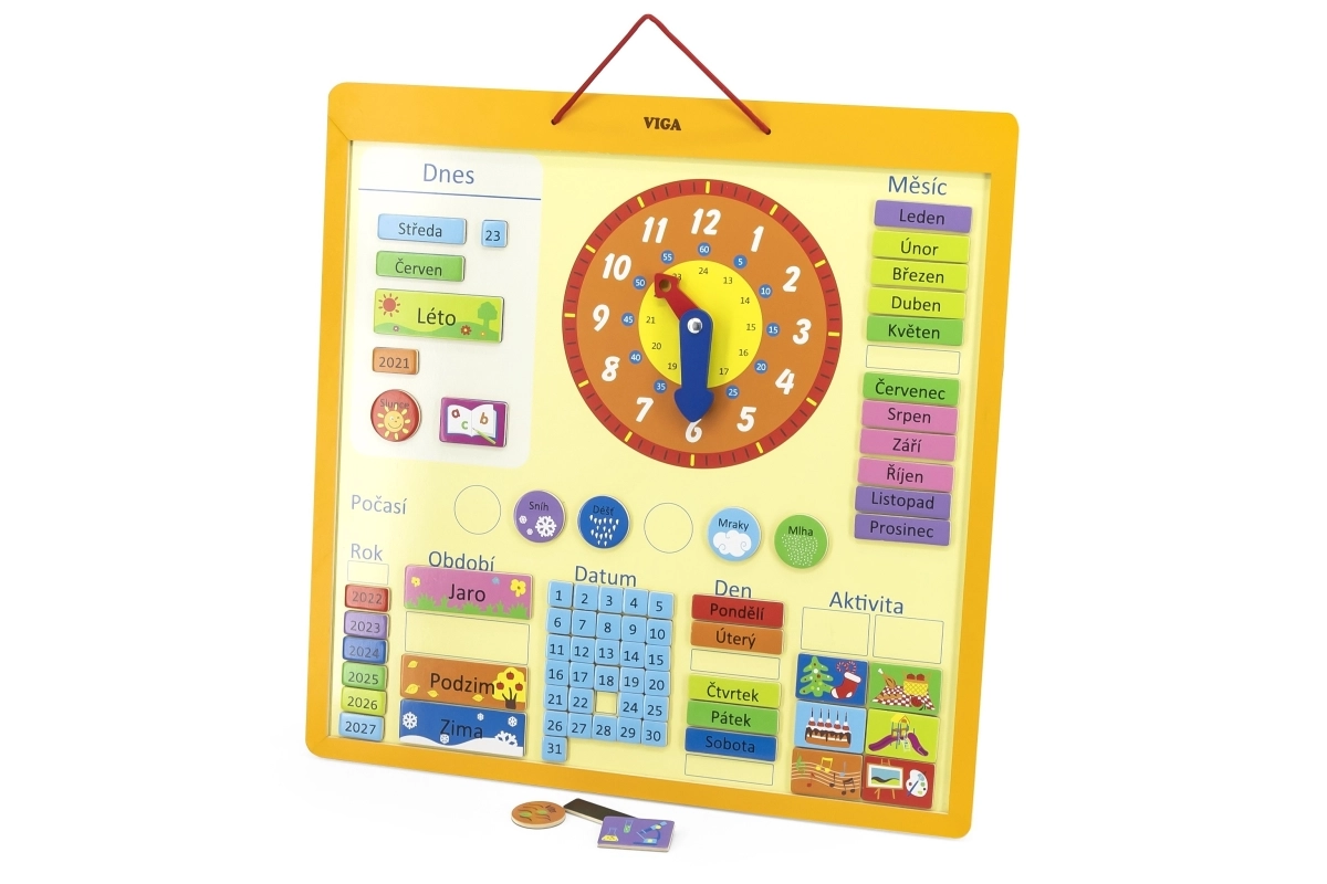Questo grande calendario in legno è un supporto ideale per l’apprendimento e il gioco di tutti i giorni. Grazie al layout chiaro e alle etichette in ceco, i bambini acquisiscono rapidamente l’orientamento nel tempo – dall’orologio e dai giorni fino ai mesi e alle stagioni. Le tessere magnetiche si possono spostare con facilità, rendendo l’apprendimento interattivo e divertente.