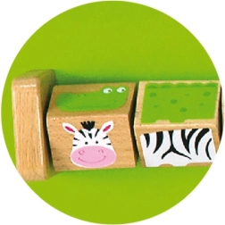 Tre prismi con illustrazioni di animali che i bambini ruotano e combinano per creare l'immagine corretta – allenano logica, pazienza e percezione visiva.