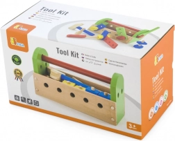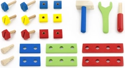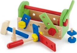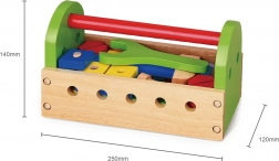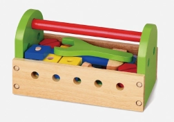 Divertente e sicuro set di attrezzi in legno per piccoli tuttofare dai 3 anni, in una pratica cassetta. Include cacciavite, martello, chiave e colorati viti, dadi e listelli per avvitare. Sostiene lo sviluppo di motricità fine, coordinazione e fantasia grazie alla qualità della lavorazione in legno.