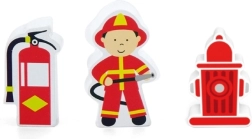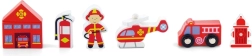 Include pompiere, stazione dei pompieri, estintore, idrante, camion dei pompieri e elicottero, tutto in colori vivaci per un gioco emozionante.