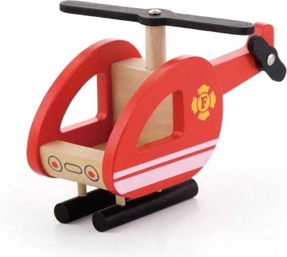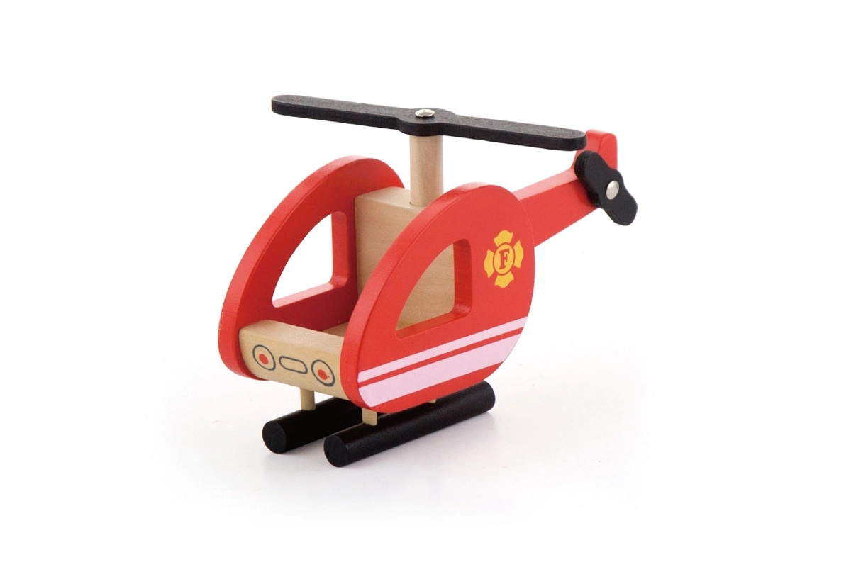 Compatto elicottero in legno con rotore girevole e pattini stabili, perfetto per completare ogni missione di salvataggio dall’alto.