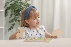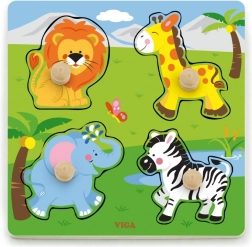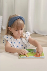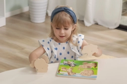 La base in legno stabile con bordi fresati assicura che i pezzi restino ben fermi e allo stesso tempo favorisce la percezione delle forme, la pazienza e il pensiero logico. Il puzzle è ideale per la prima conoscenza degli animali e lo sviluppo del linguaggio.