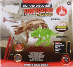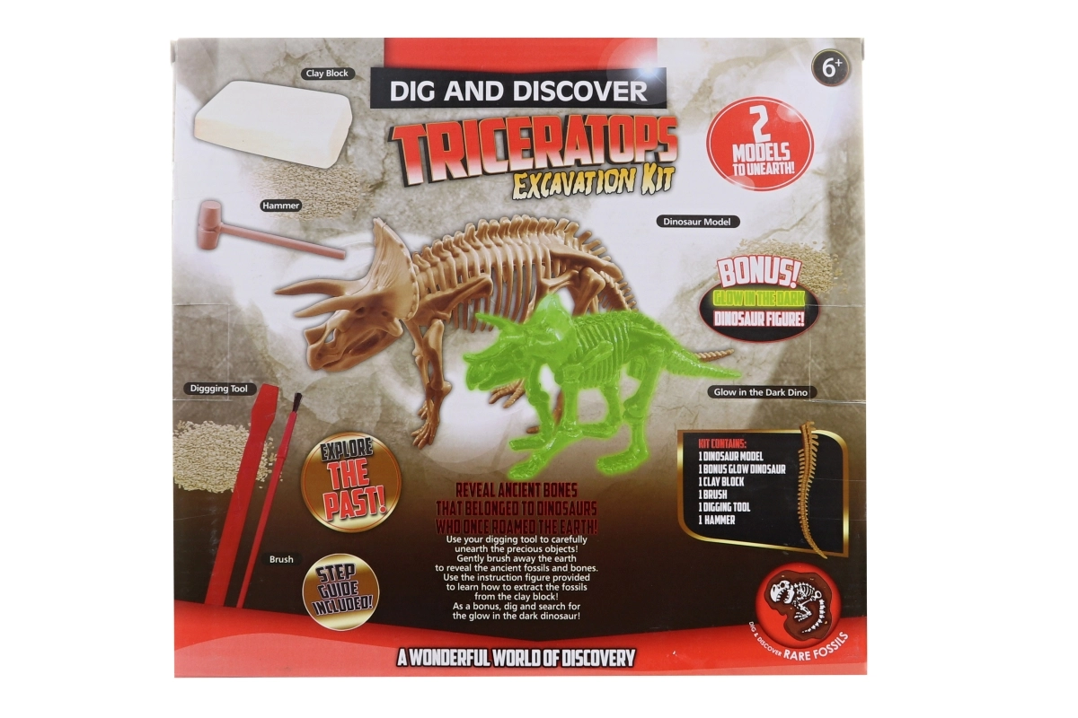- Blocco da scavare, martelletto, pennellino, strumento da scavo, scheletro di triceratopo (10 pezzi), figurina che si illumina al buio