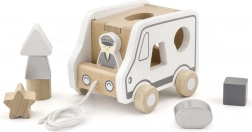 Questo gioco trainabile in legno a forma di camion combina due attività amate: trainare con la cordicella e inserire le forme. I bambini sviluppano il riconoscimento delle forme e la percezione spaziale, divertendosi con il movimento e il gioco di fantasia con un dolce camioncino.