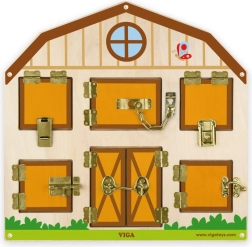 Questo gioco in legno di qualità, a forma di casetta, offre diverse porticine con vari tipi di serrature – ganci, chiavistelli, catenelle o scrocchi scorrevoli. A ogni apertura i bambini trovano una sorpresa sotto forma di animaletti illustrati, stimolando curiosità, concentrazione e coordinazione occhio–mano.